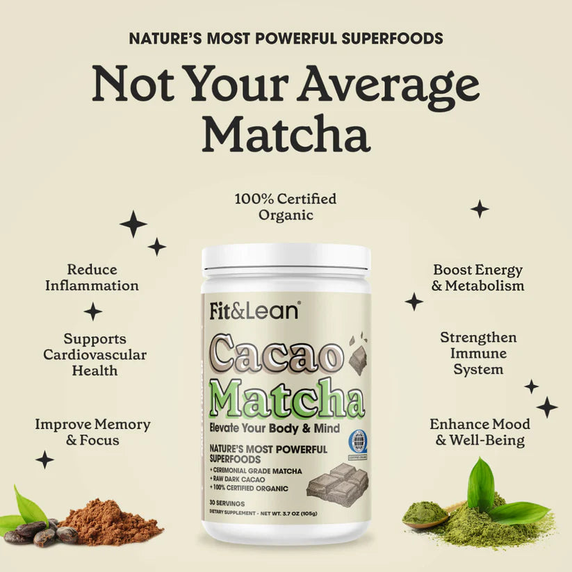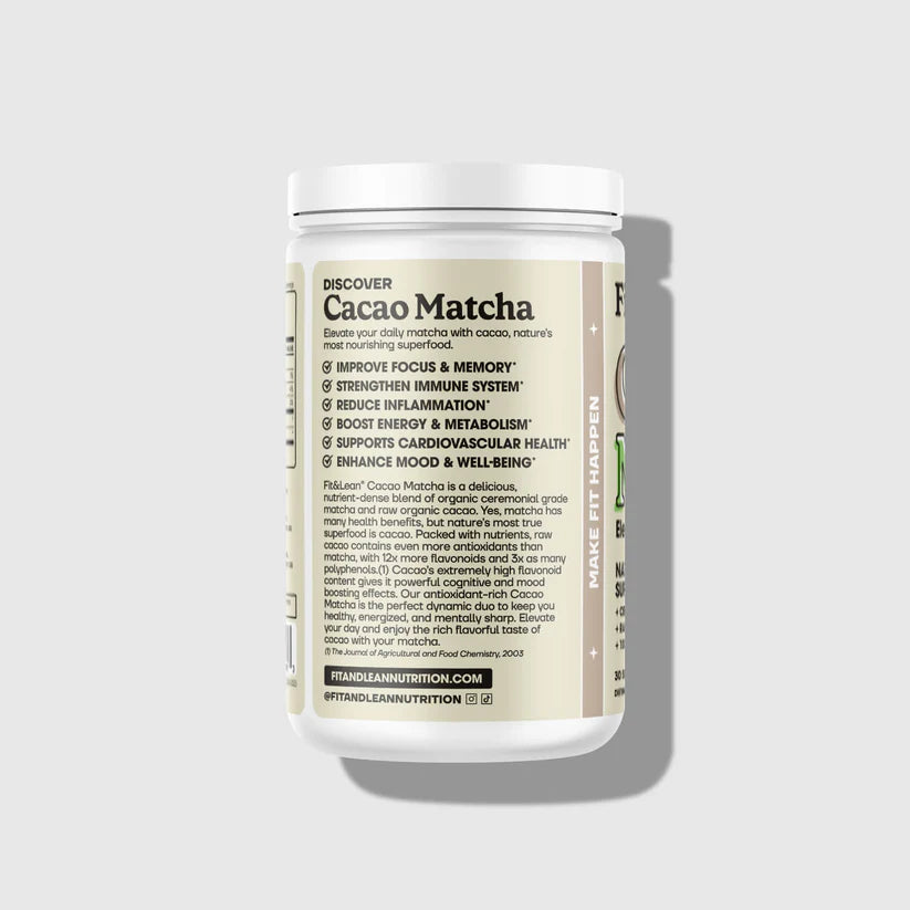 I SUPERFOOD PIÙ POTENTE DELLA NATURA Eleva il tuo matcha quotidiano con il cacao, il superfood più nutriente della natura. Fit&Lean Cacao Matcha è una deliziosa miscela ricca di sostanze nutritive di matcha biologico di grado cerimoniale e cacao biologico crudo. Sì, il matcha ha molti benefici per la salute, ma il vero superfood della natura è il cacao. Ricco di sostanze nutritive, il cacao crudo contiene ancora più antiossidanti rispetto al matcha, con 12 volte più flavonoidi e 3 volte più polifenoli.Il Cacao e l'altissimo contenuto di flavonoidi e polifenoli conferisce un potente effetto cognitivo e migliora l'umore. Il nostro Cacao Matcha, ricco di antiossidanti, è il duo dinamico perfetto per mantenerti in salute, energico e mentalmente acuto. Eleva la tua giornata e goditi il ricco sapore del nostro cacao Matcha. Riduce l'infiammazione Migliora la concentrazione e la memoria Rafforza il sistema immunitario Aumenta l'energia e il metabolismo Supporta la salute cardiovascolare Migliora l'umore e il benessere IL SUPERFOOD PIÙ POTENTE DELLA NATURA – Fit&Lean Cacao Matcha è una miscela di cacao crudo biologico e matcha cerimoniale biologico. PIÙ ANTIOSSIDANTI DEL NORMALE MATCHA – Il cacao crudo ne contiene ancora di più antiossidanti rispetto al matcha, con 12 volte più flavonoidi e 3 volte più polifenoli. ENERGIA E CONCENTRAZIONE SENZA NERVOSISMO – Contiene una miscela bilanciata di caffeina, teanina, e teobromina per fornire energia stabile , supportando al contempo funzione cognitiva e chiarezza mentale. INGREDIENTI PURI E DI ALTA QUALITÀ Realizzato con ingredienti puri e biologici al 100% – 2,5 g di cacao crudo biologico e 1 g di matcha cerimoniale giapponese biologico -– senza additivi o dolcificanti artificiali! 100% BIOLOGICO, NON OGM, VEGANO, SENZA GLUTINE E SENZA SOIA – Il nostro Cacao Matcha è USDA biologico, non OGM, vegano, senza glutine e senza soia. OTTIMO GUSTO - Il sapore ricco e cremoso del cacao si abbina al gusto terroso del matcha. Il nostro Cacao Matcha ha un sapore delizioso e può essere gustato sia freddo che caldo. Prepara con solo acqua o aggiungi il tuo latte e/o dolcificanti preferiti per un delizioso matcha latte!
